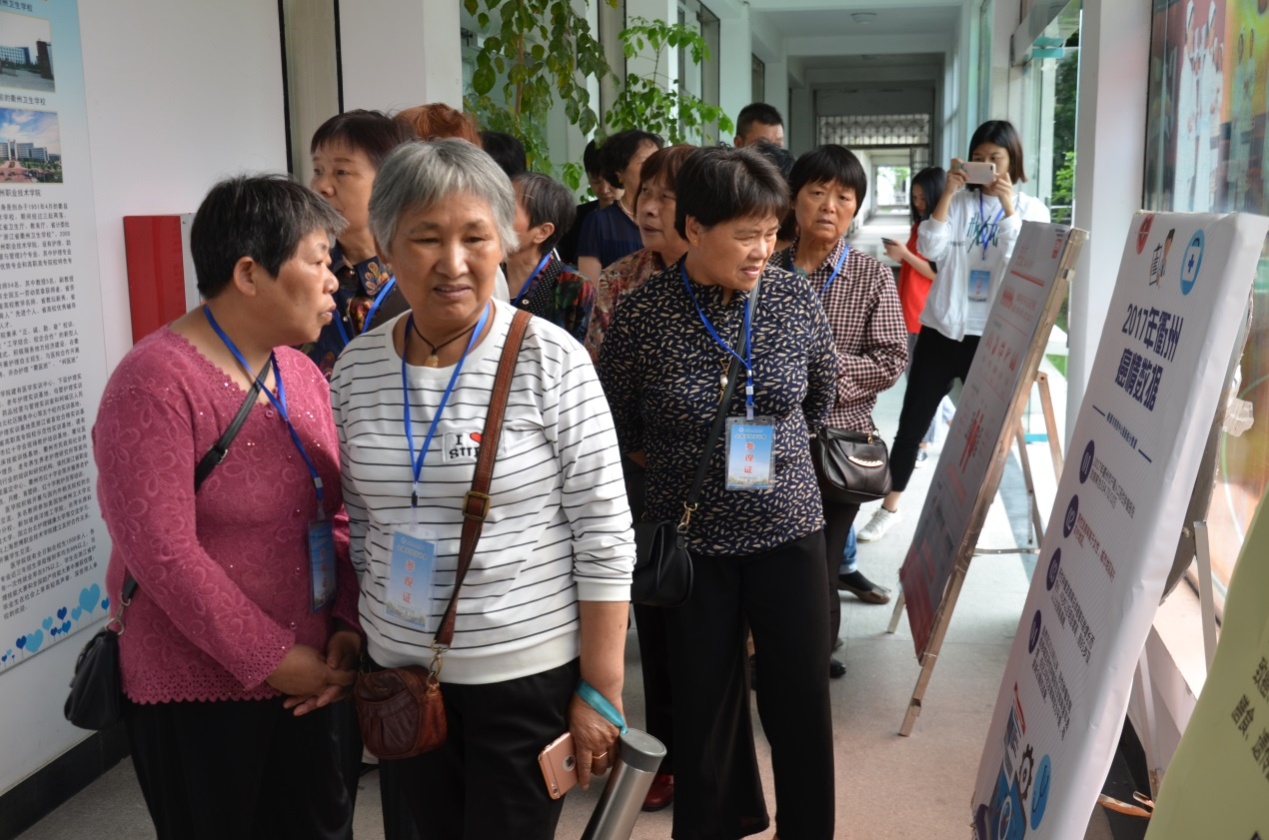 在医学院实训中心连廊,白云社区的大爷大妈们仔细参观了防癌科普展板,并不时地与同行人员讨论交流。