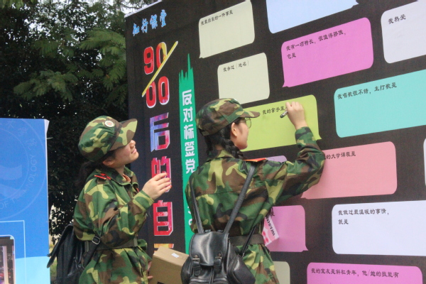 随着网络时代的到来,标签党大行其道,给90、00后贴上各类标签,如宅男宅女、二次元、啃老族、颜控等。为鼓励学生冲破标签党束缚,跳出惯性思维,提高学生自信心,帮助90、00学生群体认识自我、勇于表达正能量的自我、悦纳自我。近日,学生处组织开展“90、00自画像”活动,大学生自我发展中心学生干事通过一对一交谈,引导同学们发掘内心自我,鼓励其写出来。三百余名学生在空白的喷绘上留下了对自我、对人际关系、对未来的表达。