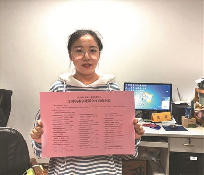 看着两旁修建整齐的绿篱,干净的路面,徐茗婕心情很好,在《文明城市创建满意度调查问卷》上勾选上满意的选项,“校园就是我们的家,我们在学校里学习、生活,她的整洁美丽离不开我们每个人,我们也代表着学校的形象。”