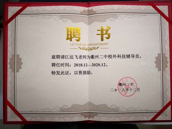 2016~2018年期间, 在信息工程学院创新工作室中制作、调试的科技创新作品,共获得青少年科技创新大赛全国二等奖1项,省1等奖3项。 信息工程学院江达飞老师被衢州二中聘为科技辅导员,参与指导的“具有多种服务措施的安全型自动扶梯”作品,在全国第18届“明天小小科学家”奖励活动上,荣获全国一等奖,参与活动的二中学子荣获本届活动最高奖——“明天小小科学家”的称号。
