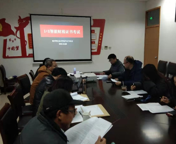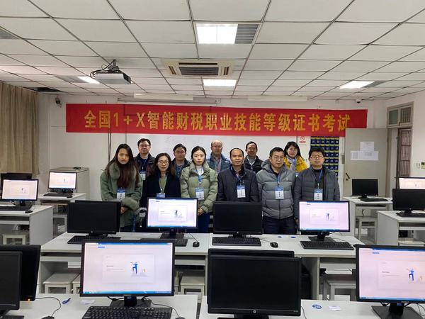 智能财税职业技能等级证书是全国首个财经类1+X证书。自全国1+X证书试点工作启动以来,我校经济管理学院密切关注证书试点工作进程,积极申报试点并于2019年9月顺利获得首批试点资格,获批后经济管理学院领导高度重视试点工作,成立了1+X智能财税职业技能等级证书工作小组并制定了工作实施方案。11月汪榜江副院长带队参加省“智能财税职业技能等级证书试点工作说明会”,学习试点工作相关文件,先后安排7名会计教师参加师资培训。12月初会计专业启动学生培训工作,按照“自愿报名,免费培训”原则,在不影响学生正常教学计划的情况下,培训教师利用课后、晚上及周末休息时间,进行了为期两周近100课时的培训。12月中旬在教务处组织下成立考务组,由经济管理学院承担具体考务工作,12月26日考务组召开考务会议,教务处王建处长强调了本次考务工作的重要意义并提出了严格要求,经济管理学院覃龙飞副院长作了具体工作安排;在周密的工作安排和精心考前准备下,12月29日正式开考,值班校领导巫少龙副校长到现场指导工作,主考、监考和其他考务工作人员严格遵守工作流程,严守考试纪律;考场技术保障有力,系统稳定,秩序井然,顺利完成考试工作。