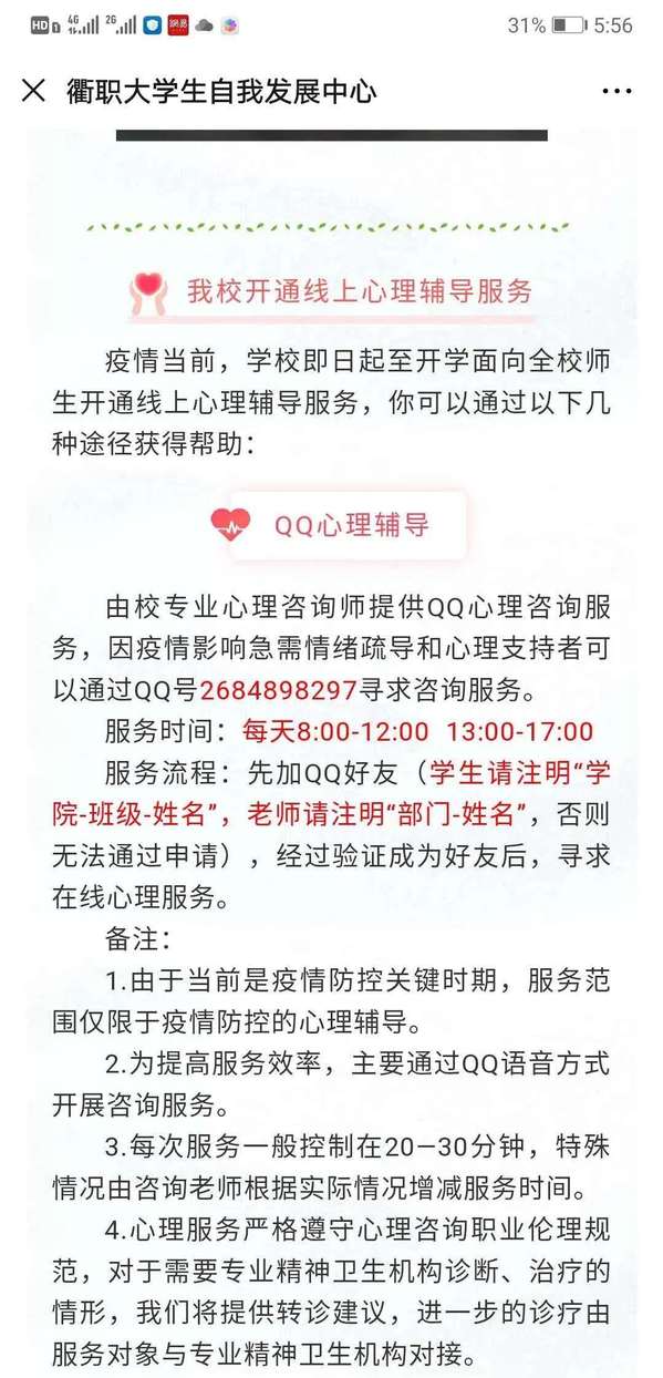 机关第六党支部则立足于自身工作,为专升本学生提供免费辅导,其中黄建华老师更是在家里老父病危的情况下依然坚守岗位,及时为同学们解疑答惑。学生处组织全校14名心理咨询师和专职心理辅导员开通线上心理服务,为在家工作、学习的师生提供线上心理咨询。医学院教师兰常林积极响应市总工会的号召,组织参与建设衢州市心理援助热线和心理辅导服务平台,为市民戴上“心理口罩”。