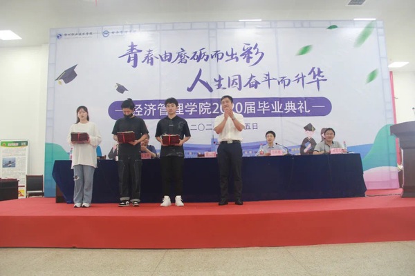 典礼在雄壮的国歌中拉开序幕。尔后,经管副院长兼党总支副书记覃龙飞宣读省级、院级优秀毕业生名单,经济管理学院副院长汪榜江教授为其颁发荣誉证书。傅元勋副校长宣读经管2020届毕业生名单,并为毕业生代表颁发毕业证书。