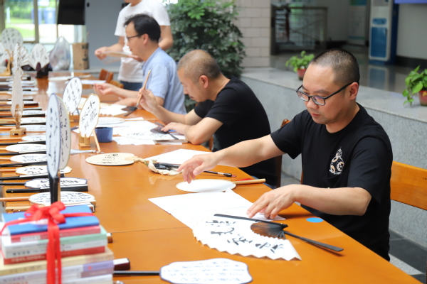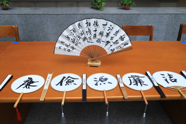 书籍赠送活动刚一结束,“笔墨书廉洁 廉扇送清风”活动就牢牢吸引住了大家的目光。校书法协会的会员,以廉洁诗文、廉洁成语和廉政格言警句等为内容现场挥毫泼墨,书写“清廉扇”,赠送“清廉扇”。