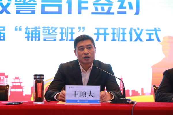 王顺大讲话。他说,首届“辅警班”将就人才培养、基地建设、技术研发、职业技能培训等方面达成战略合作关系。他表示,衢州市公安系统将从身份认同、待遇提升、发展空间拓展等三方面对辅警正规化运作进行顶层化设计,以确保辅警班招录有制度保障。他认为,我校作为全日制高等学校,学生有学历优势;学校近几年在全省高校体能测试中均位全省前五,学生有身体优势;学校开设了无人机、机械制造、网络信息化技术等警务技术相关专业,学生有专业技术优势;学校学风班风良好,有纪律作风优势,这些优势都十分有利于辅警队伍的履职和队伍建设。对于下一步的合作,他希望进一步扩大招生规模,进一步加强就业保障,进一步扩大合作范围,让首届“辅警班”成为可复制可推广的衢州样板。