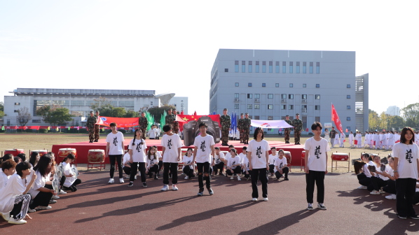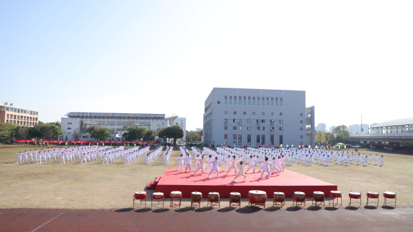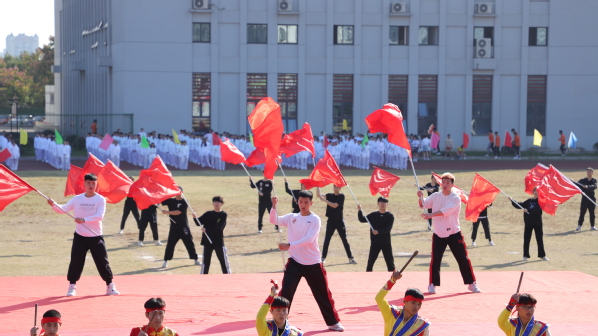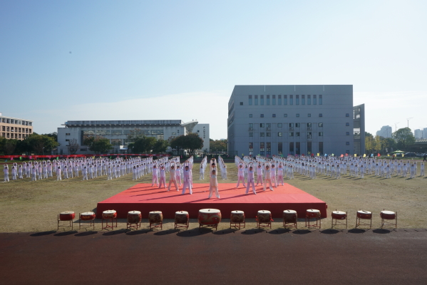 休闲体育专业的同学为大家带来旗鼓表演。红旗飘飘、战鼓雷鸣;由六个二级学院的400名2019级同学共同表演的节目是健身气功——八段锦,整齐划一,修身养性;校健美操舞姿曼妙,他们跃动的步伐洋溢着青春的活力,脸上欢快的笑容充满着自信,带动了会场的欢腾。