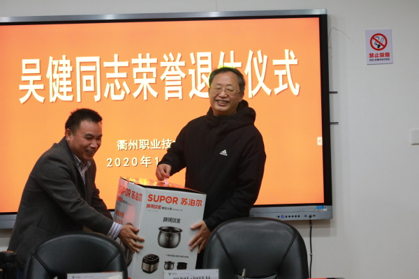 吕延文为吴健同志颁发退休证书,青年教师代表吴燕萍献花,校工会常务副主席江红军同志代表工会赠送纪念品。