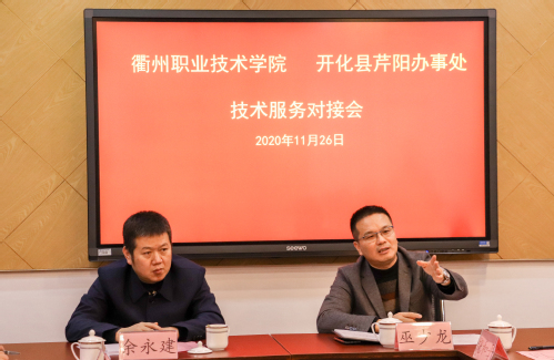 余永建重点介绍了开化芹阳办事处下辖的村的总体情况,乡村建设过程中建设思路、需求原则与方向,强调“知行合一”,积极利用衢职院人才与技术服务资源解决开化芹阳办事处下属村镇建设存在的问题,提升村级管理质量与水平,也希望双方能尽快达成具体的技术服务事项,他表示在技术服务具体实施过程中也会在人力、物力方面给予支持保障。