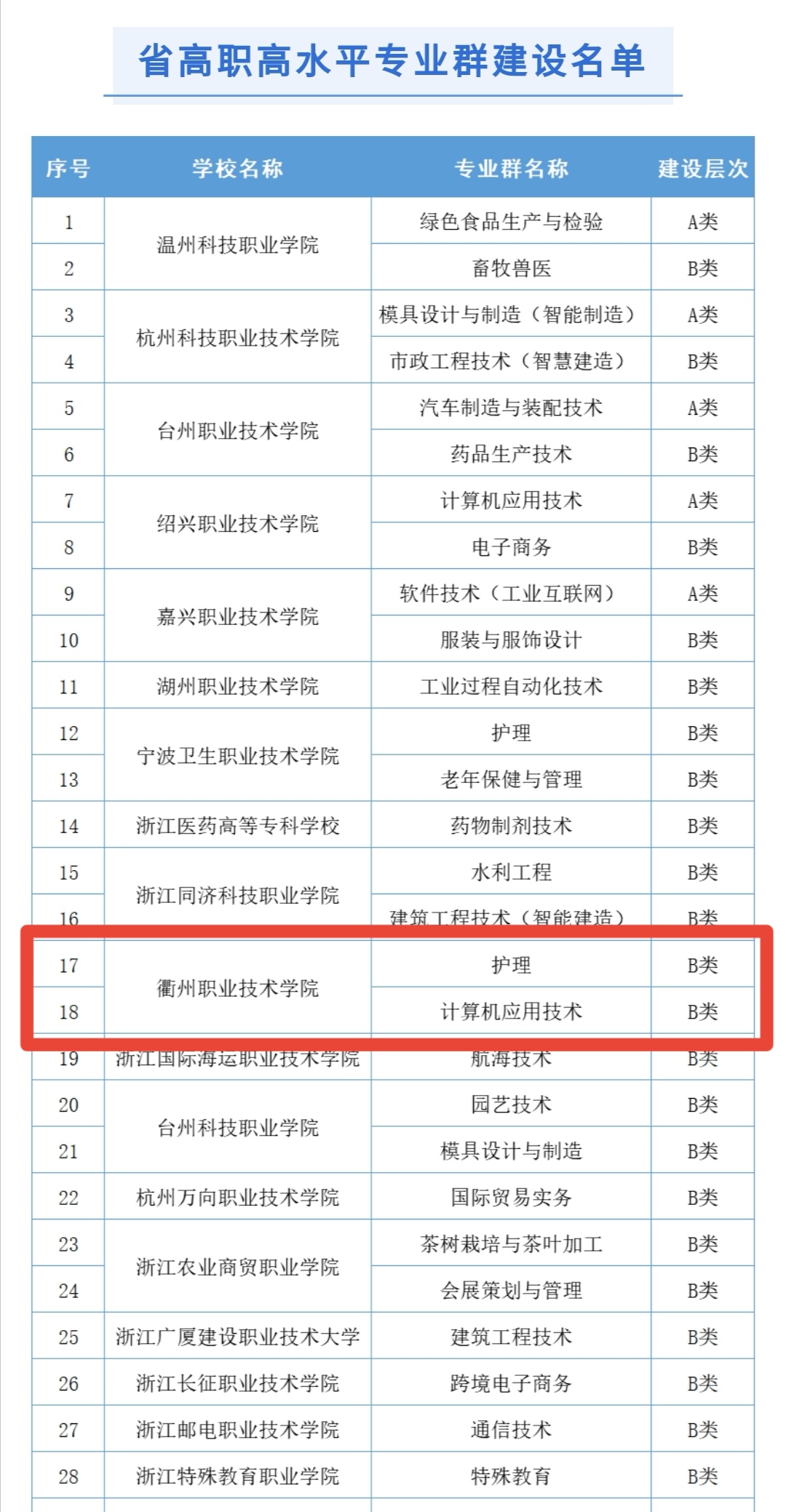 近日,省教育厅、省财政厅公布了浙江省高水平职业院校和专业(群)建设名单,确定30个高职专业群为省高水平专业(群)建设单位,我校护理(医护康养)专业群、计算机应用技术(工业互联网)专业群入选。