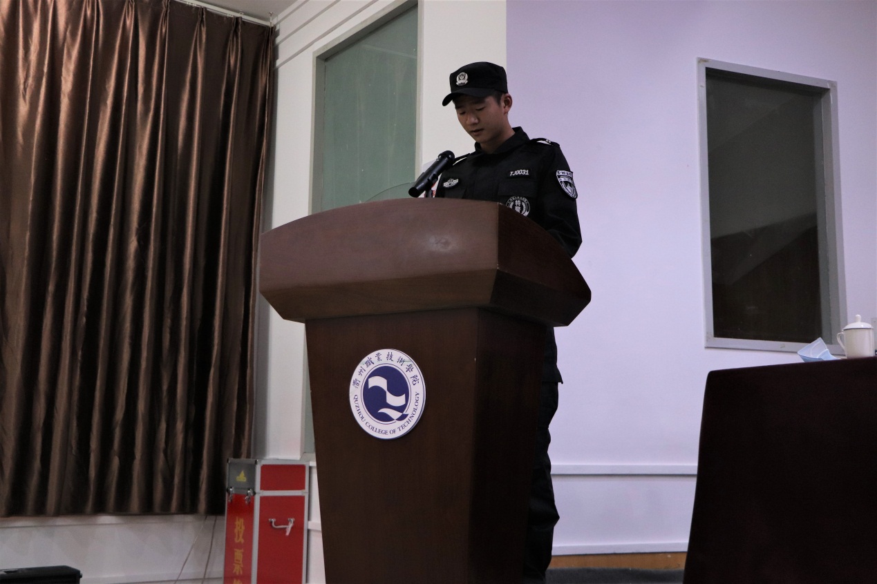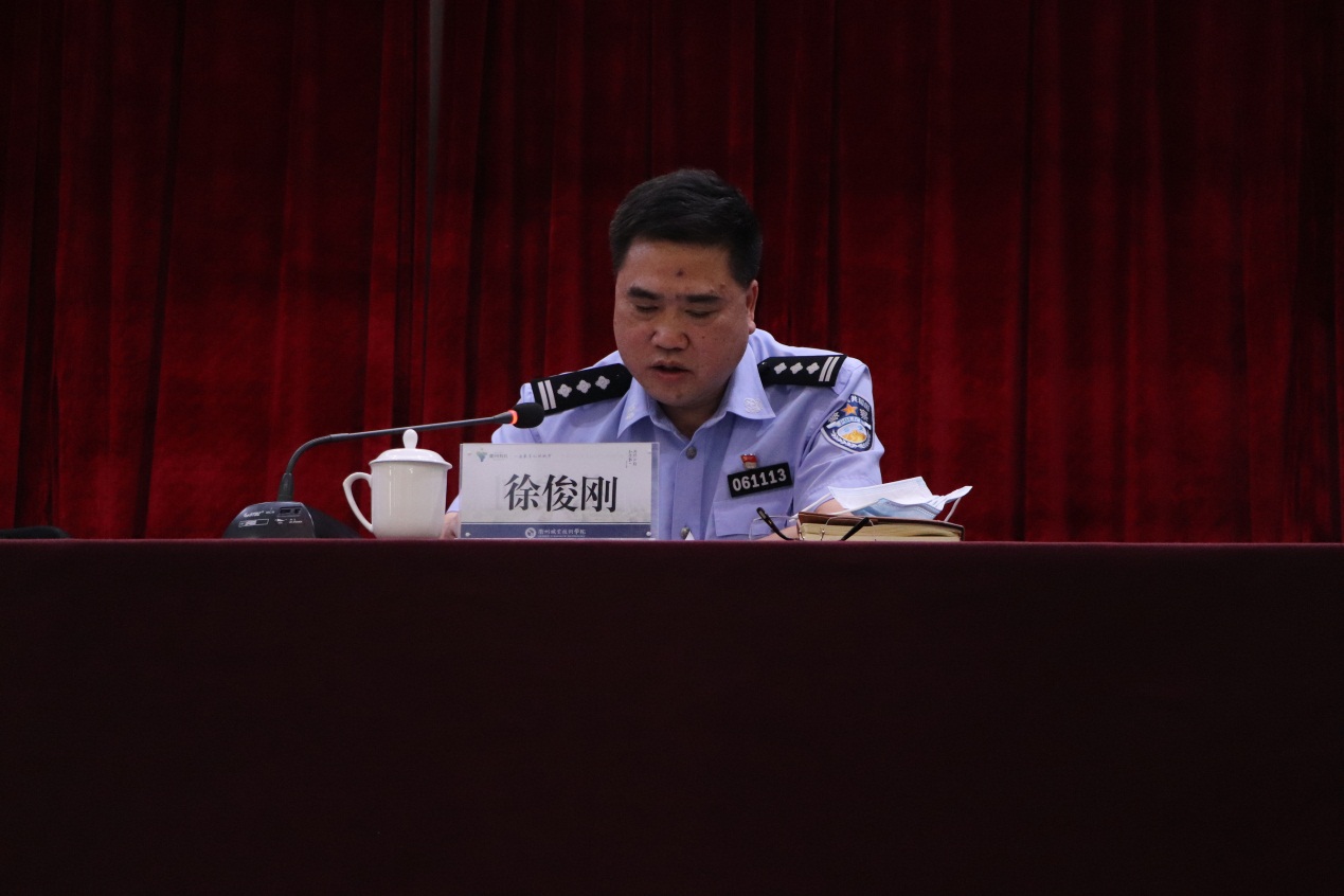 市公安局政治部副主任徐俊刚作动员讲话。徐主任阐述了校警双方设立“辅警班”的原因,介绍了辅警的工资待遇、职业发展、招聘条件以及我校学生的优势,他期望接下来能扩大“辅警班”招生规模,建立联络员机制,定期组织交流会议,保证校警双方合作顺畅。