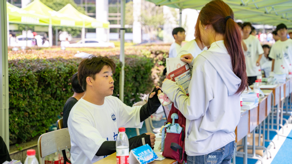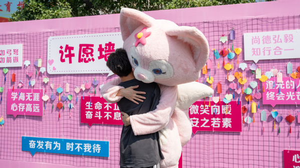 心理协会志愿者穿着玩偶服,化身为“拥抱使者”,为新生送上爱的抱抱,鼓励大家在衢职院从心出发、乘风破浪。