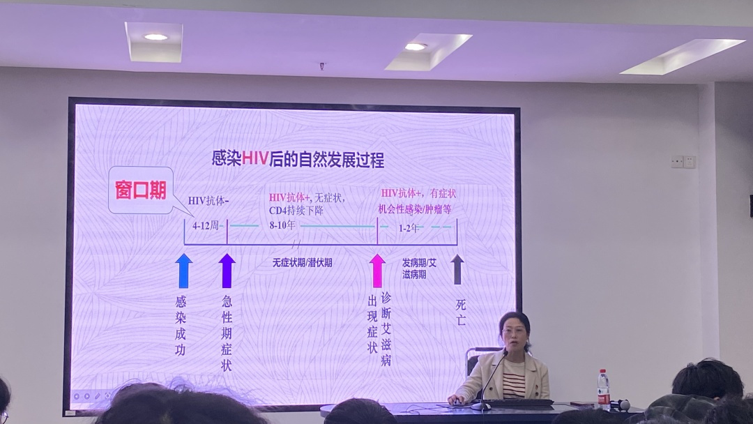 王蓉副院长从艾滋病科普、传播途径、艾滋病的危害、如何预防艾滋病、检测与治疗5个方面开始宣讲。王医生呼吁关爱艾滋病患者,消除对艾滋病患者的歧视。艾滋病感染者比常人承受的精神压力更大,心理更脆弱。他们跟常人一样需要温暖,需要关心,需要更多的帮助。艾滋病感染者只有平等就医就业就学,才能生活在阳光下与我们共享健康,从而减少传播行为和负面事件的发生。