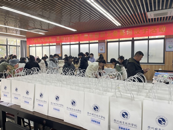 冬至来临,在学校的食堂里,来自各分工会的100多位老师们正热火朝天地进行着一场包饺子活动。他们的脸上洋溢着欢笑,手上动作娴熟,和面、擀皮、放馅、捏边,一气呵成。