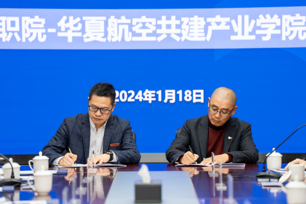 吴成富、姚水洪签订衢职院-华夏航空共建产业学院协议。