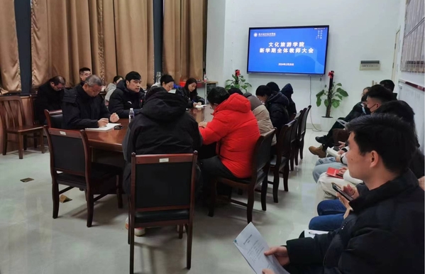 2月25日下午,文化旅游学院在体育运动中心一楼会议室召开新学期全体教师大会。会议由院长郭大勇主持,党总支书记李威、副院长黄志国、彭晓倩及学院全体教职工参会。