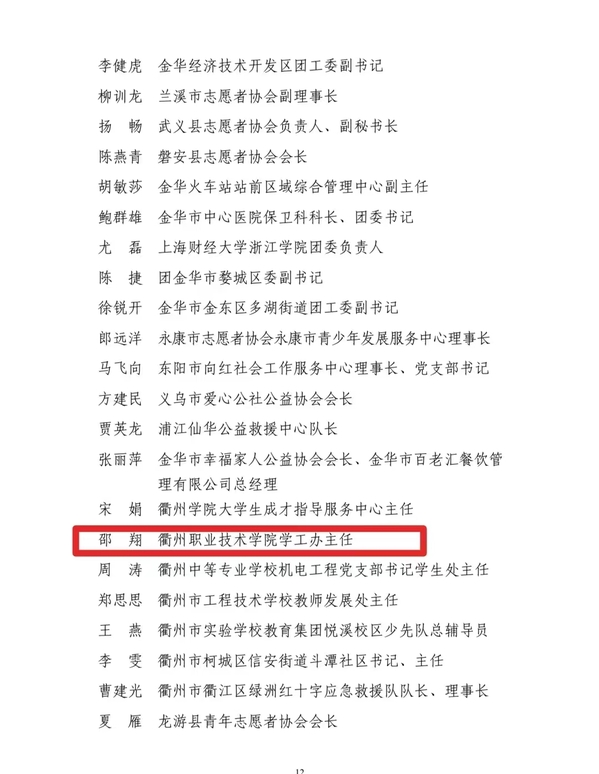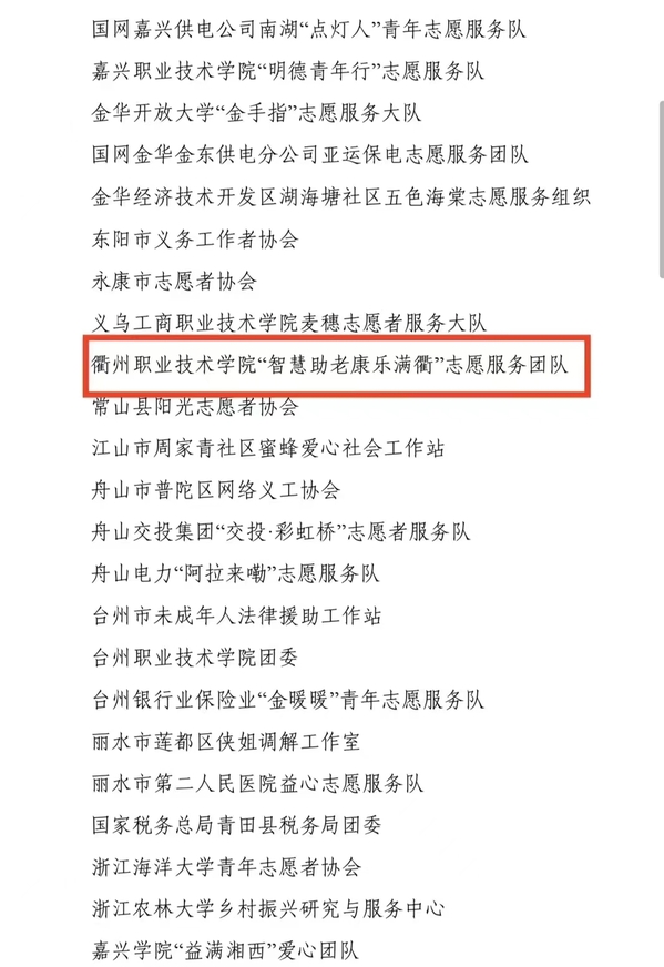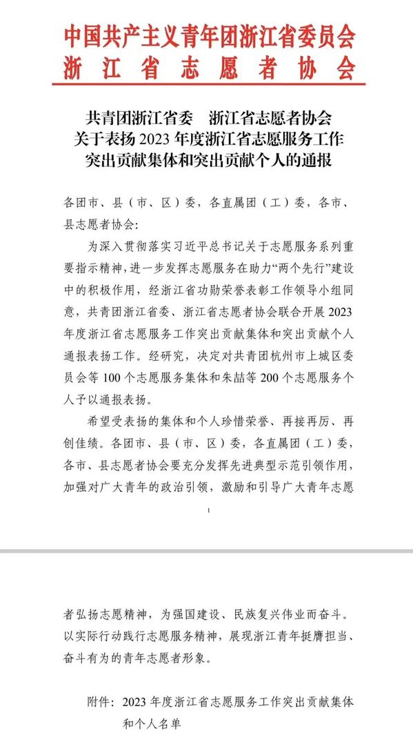 近日,共青团浙江省委、浙江省志愿者协会通报表扬了2023年度浙江省志愿服务工作突出贡献集体和突出贡献个人。校“智慧助老康乐满衢”团队荣获浙江省志愿服务工作突出贡献集体、校文化旅游学院团委书记邵翔荣获浙江省志愿服务工作突出贡献个人。