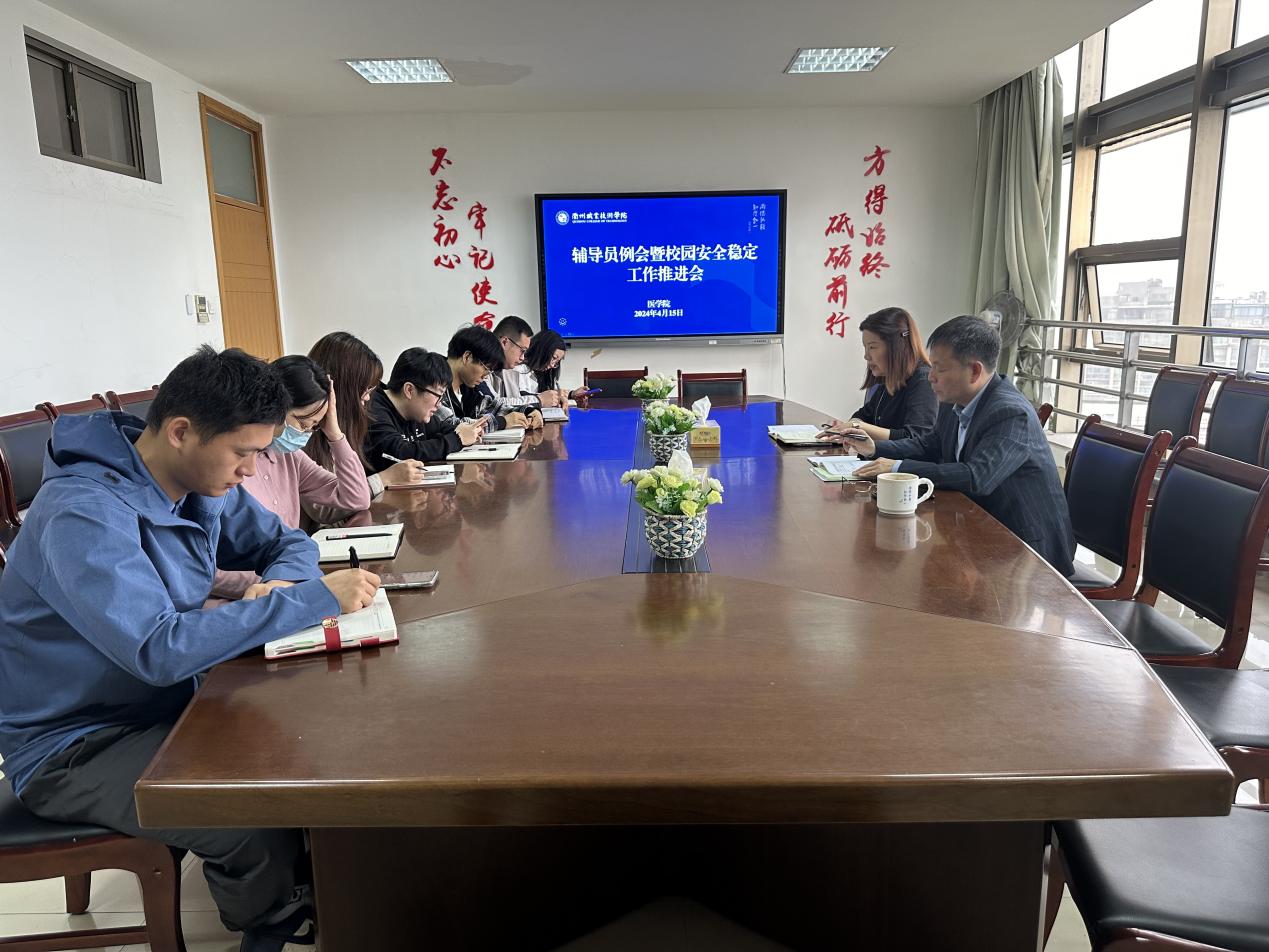 为深入学习贯彻省厅关于抓好高校校园安全稳定工作会议精神,增强底线思维,筑牢校园安全防线,医学院于4月15日上午组织召开校园安全稳定工作推进会。全体辅导员、班主任参加会议。会议由医学院党总支副书记周贞主持。