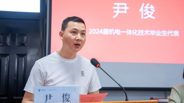 校本部机电一体化技术专业尹俊同学作为毕业生代表上台发言,他回顾了选择高等学历继续教育的初衷和学习的心路历程,由衷感谢学校和公司提供的学习机会,表示会将所学运用到实际工作中去,努力创造更好的成绩。