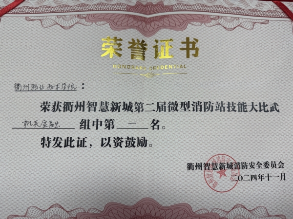 11月5日,衢州智慧新城消防安全委员会举办第二届微型消防站技能大比武,共26支队伍参加金融机关组的竞赛。我院代表队经过多轮激烈的角逐,一举夺得2个单项第一,并最终取得了综合排名第一的优异成绩。