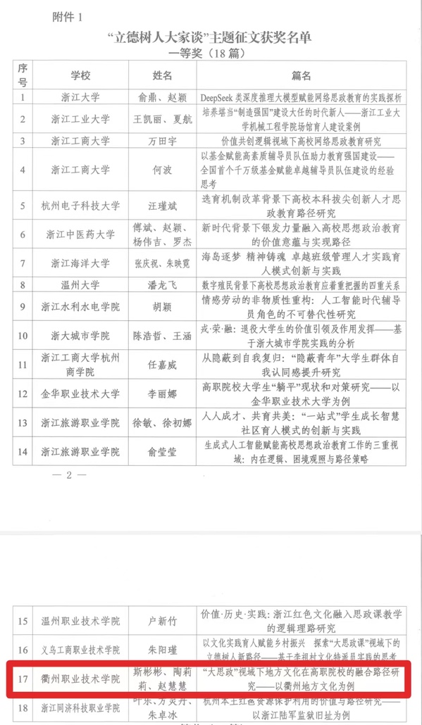 学校将以此次获奖为契机,进一步总结经验、凝练特色、打造品牌,持续推动思政工作守正创新,努力构建更加完善的“大思政”工作格局,为培养担当民族复兴大任的时代新人贡献更多衢职智慧和力量!